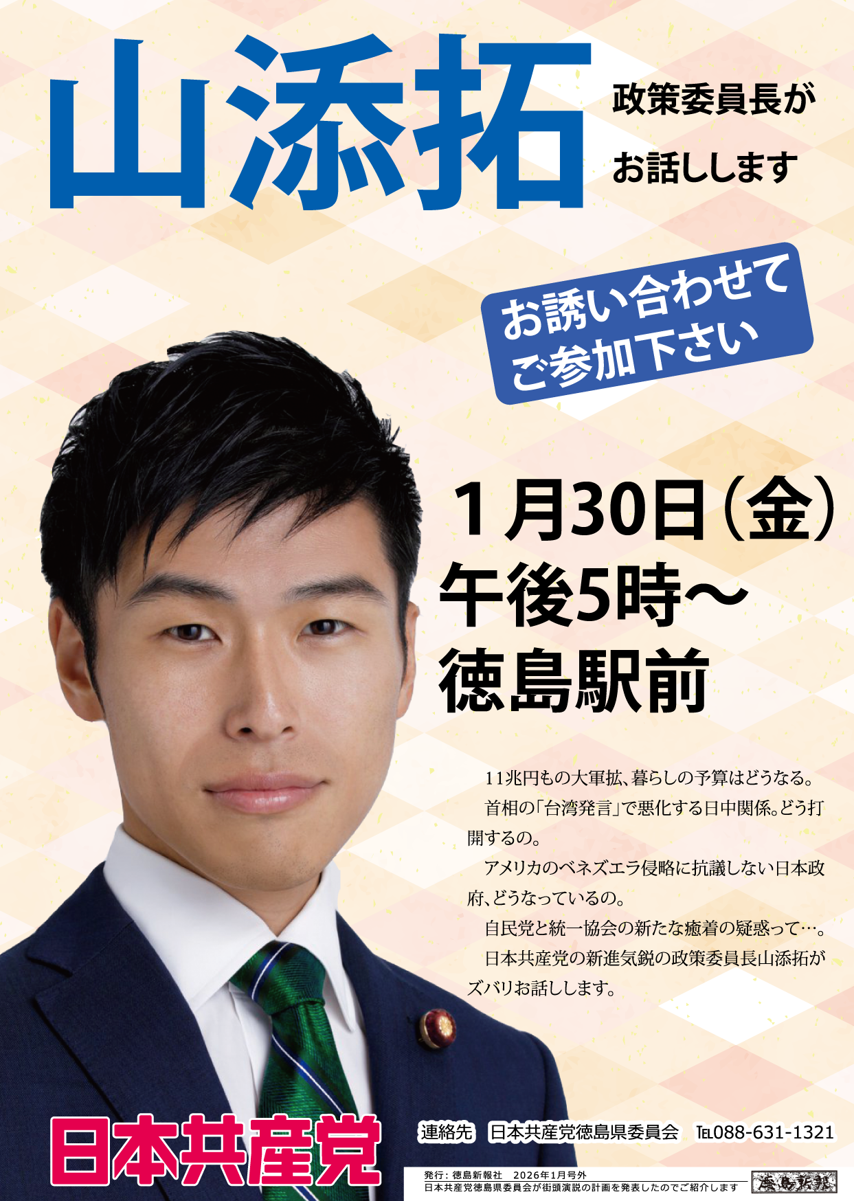 Info 12月21日たつみコータロー来たる! – 日本共産党徳島県委員会 ほっとまんぷくプロジェクトNEWS 2026年1月20日 [緊急]1月30日(金)山添拓来たる! 2025年12月3日 12月21日たつみコータロー来たる! 2025年11月25日 阿南市議選挙、鳴門市議選挙の結果について 2025年11月20日 11月23日投開票 鳴門市議選 上田公司猛奮闘! 2025年11月9日 11月9日阿南市議選挙[さこたつみ]スタート! 2025年8月24日 阿南地区で決起集会が開かれる 記事一覧MOVIE 未来をつくる若い世代のみなさんに日本共産党への入党をよびかけますSNSInstagram 徳島県委員会公式instagram jcp.tokushima 4日目が始まりました! 今日はいよい さらに読み込む Instagram でフォロー 徳島県委員会公式X(旧 twitter) @jcp_tokushima Tweets by jcp_tokushima
